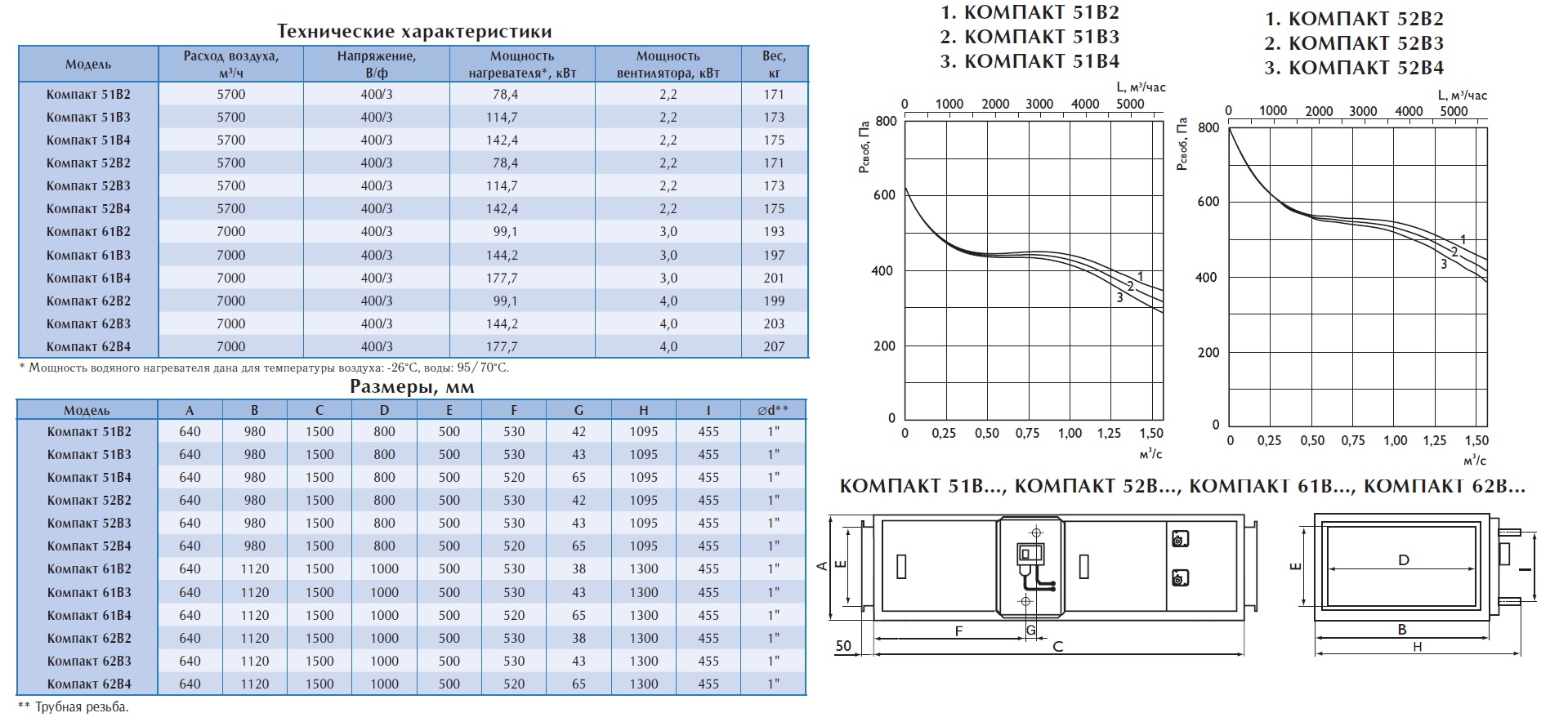 В компактном тепло-, звукоизолированном корпусе с толщиной изоляции 25 мм размещены: фильтр класса очистки G3, водяной калорифер и вентилятор с загнутыми вперед лопатками (двигатель с короткозамкнутым ротором в установках Компакт-5 или энергоэффективный электронно-коммутируемый двигатель (EC-двигатель) в установках Компакт-5 ЕС). Для индикации степени загрязнения фильтра предусмотрен датчик давления.
